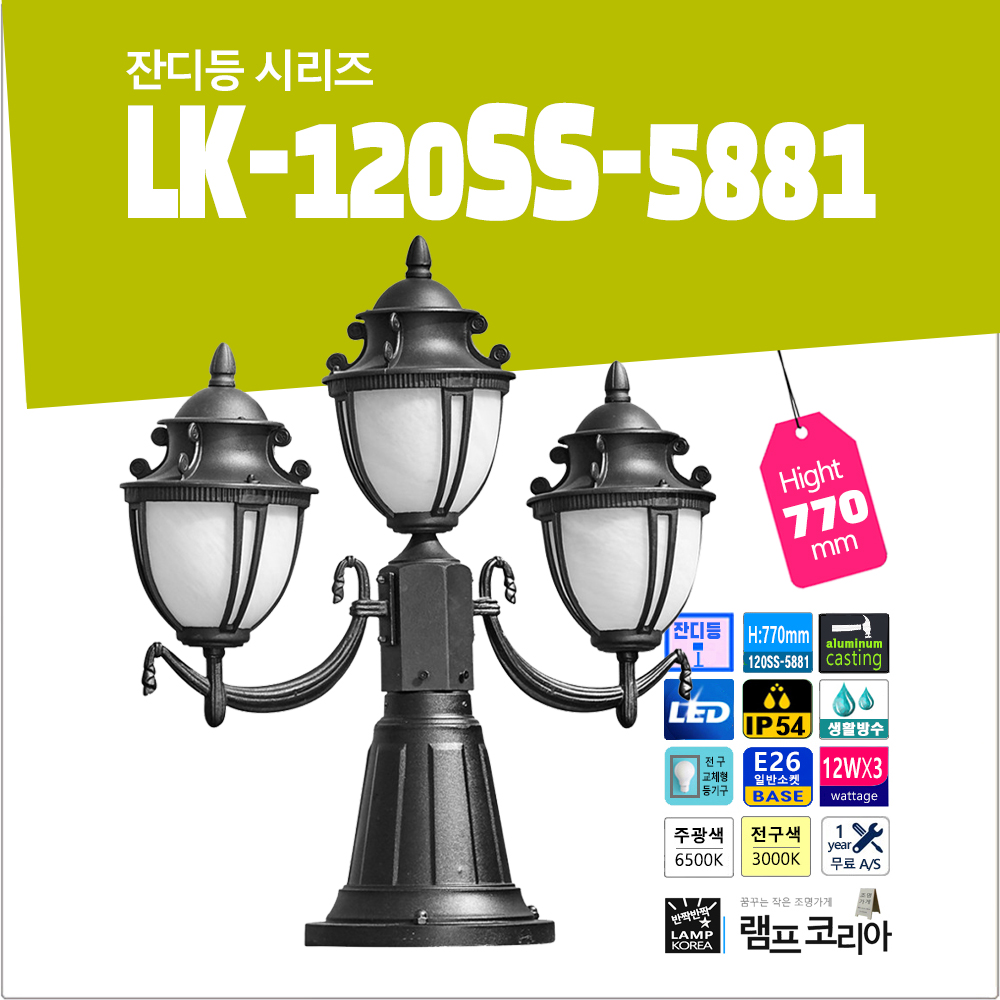 120SS-5881 W670 X H770mm 검정 (기본색) LED12W 램프 3개 사용 알루미늄 다이케스팅 국내산 잔디등 정원등