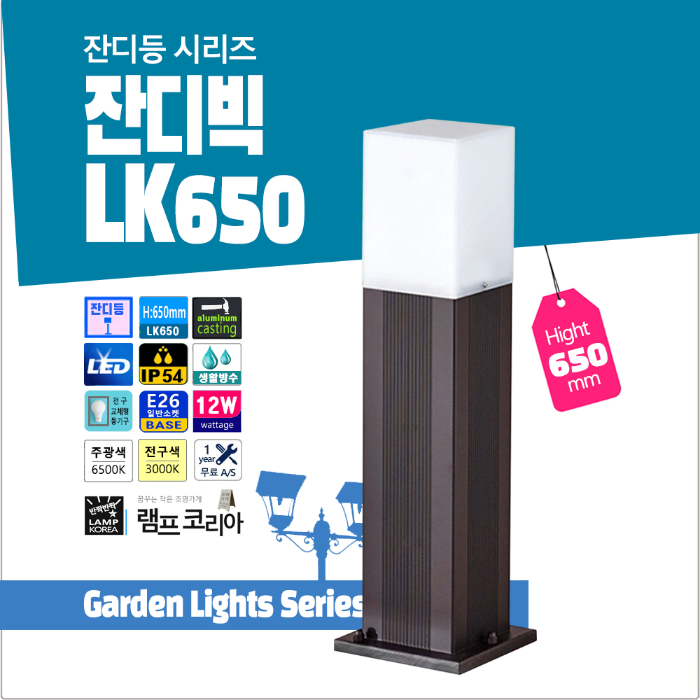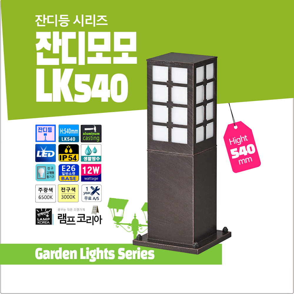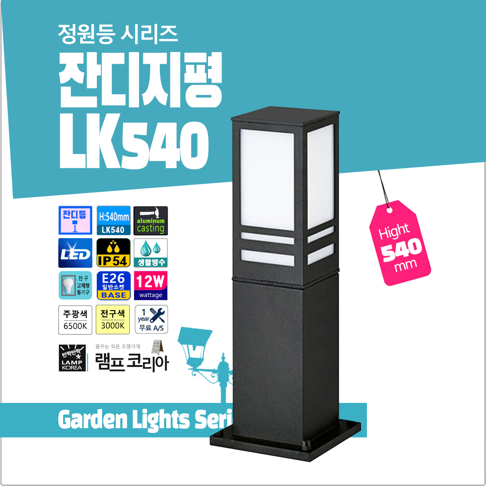 잔디지평 LK540 W130 X D130 X H540 검정색 (기본색) LED12W 램프 사용 알루미늄 다이케스팅 국내산 잔디등 정원등
