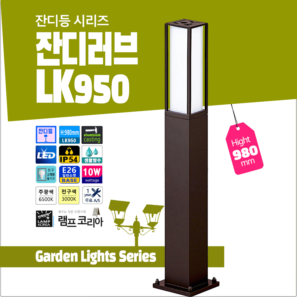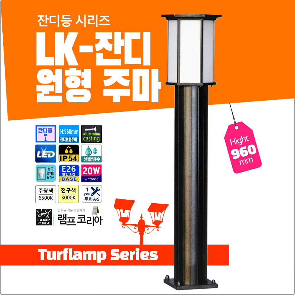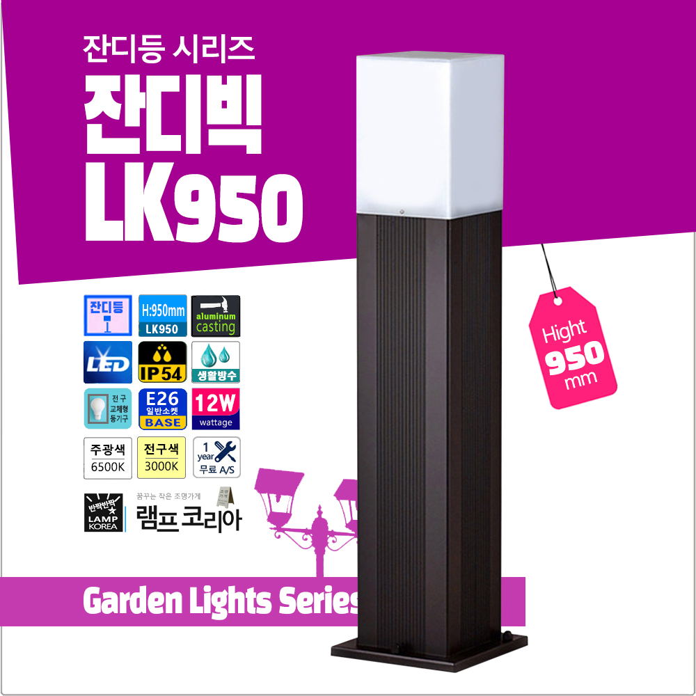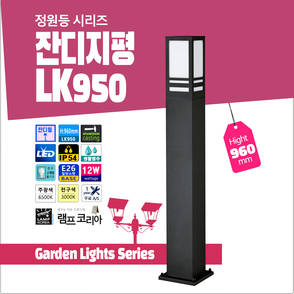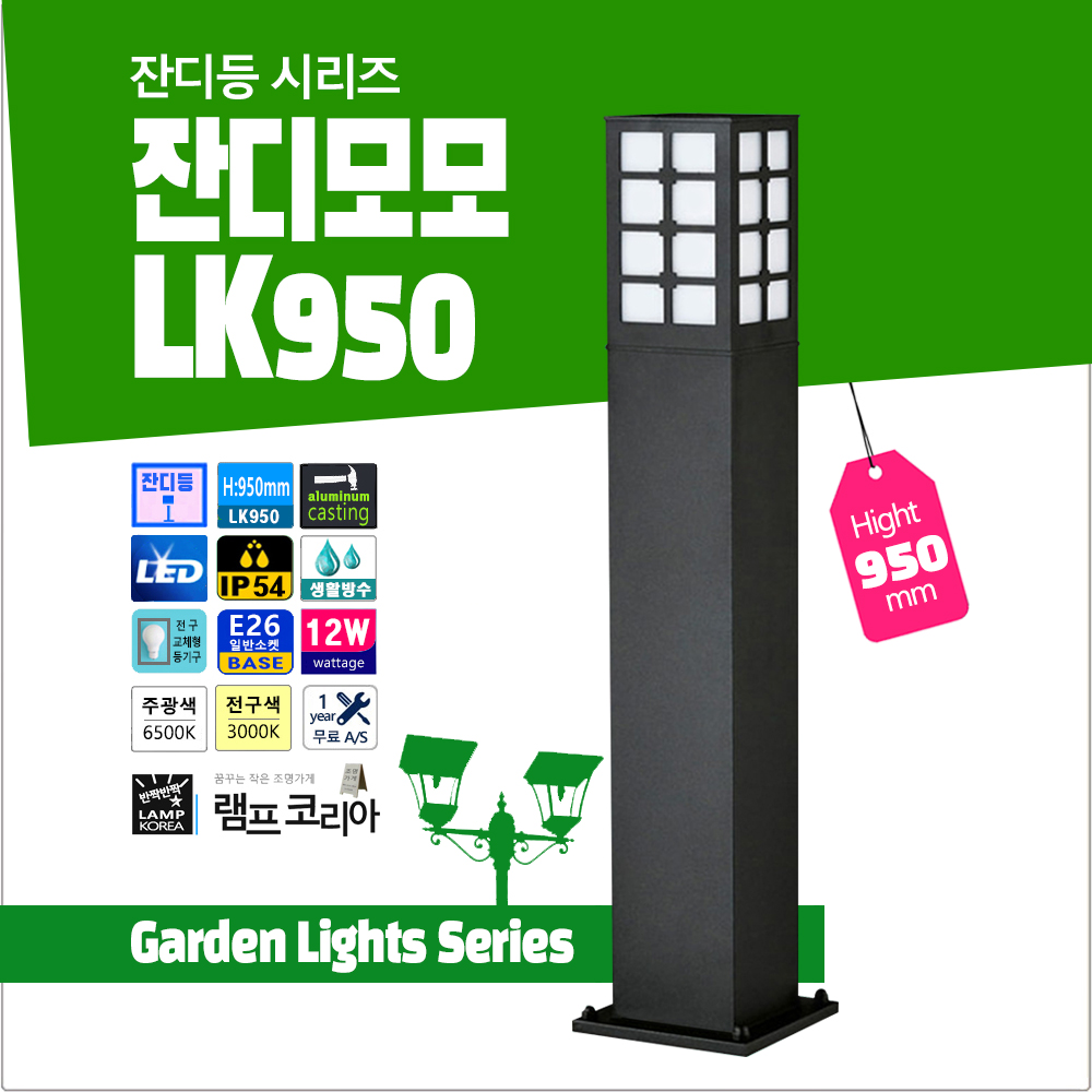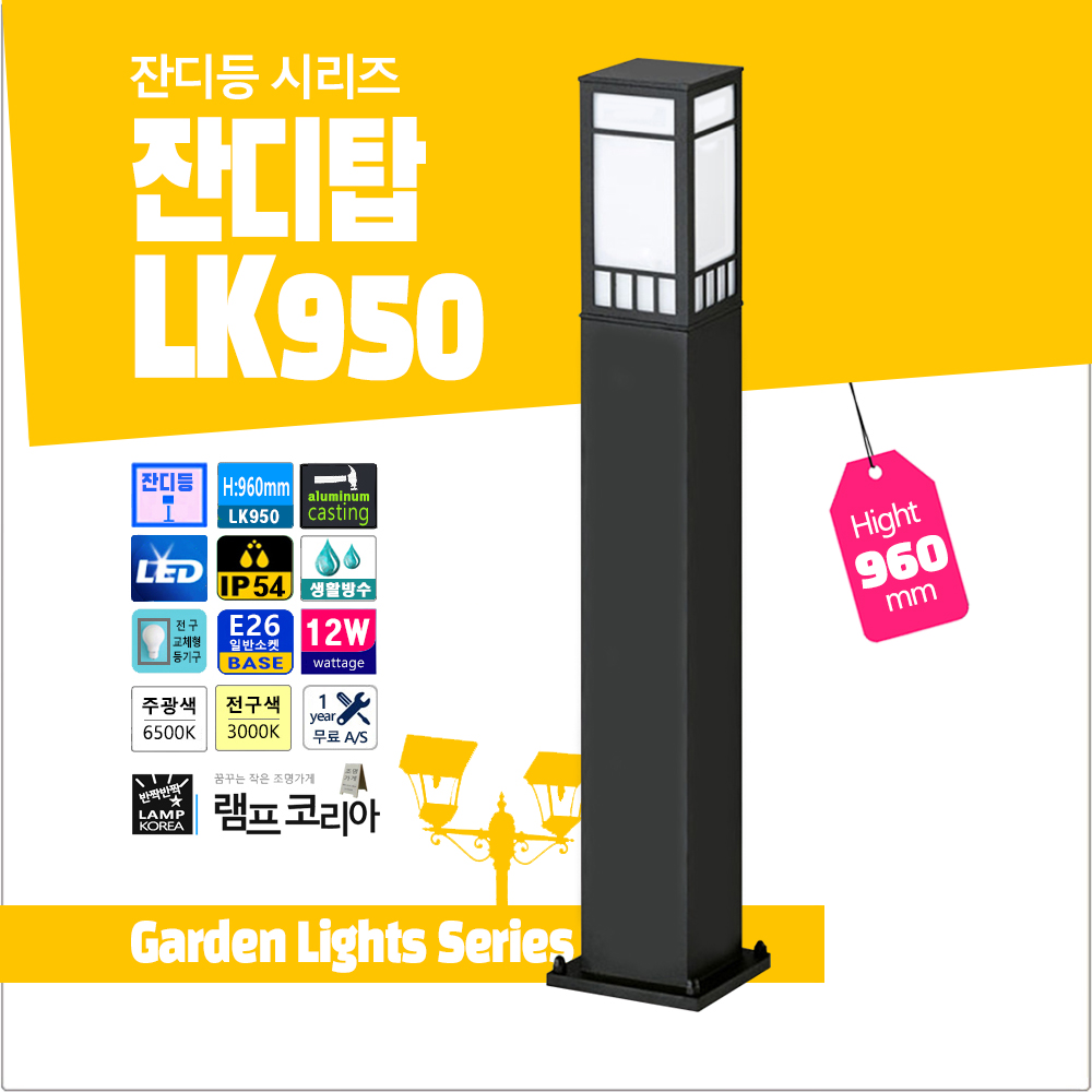 잔디지평 LK950 W130 X D130 X H960 검정색 (기본색) LED12W 램프 사용 알루미늄 다이케스팅 국내산 잔디등 정원등