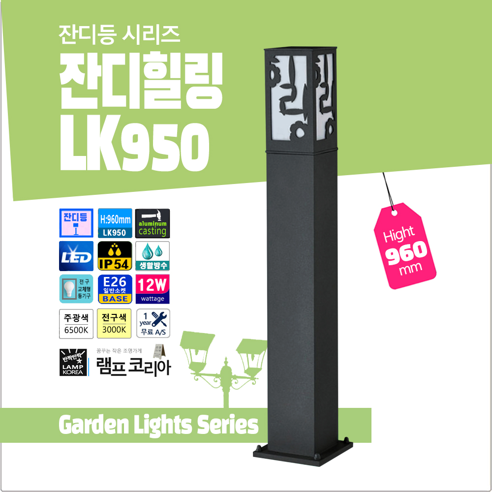 잔디힐링 LK950 W130 X D130 X H960 검정색 (기본색) LED12W 램프 사용 알루미늄 다이케스팅 국내산 잔디등 정원등