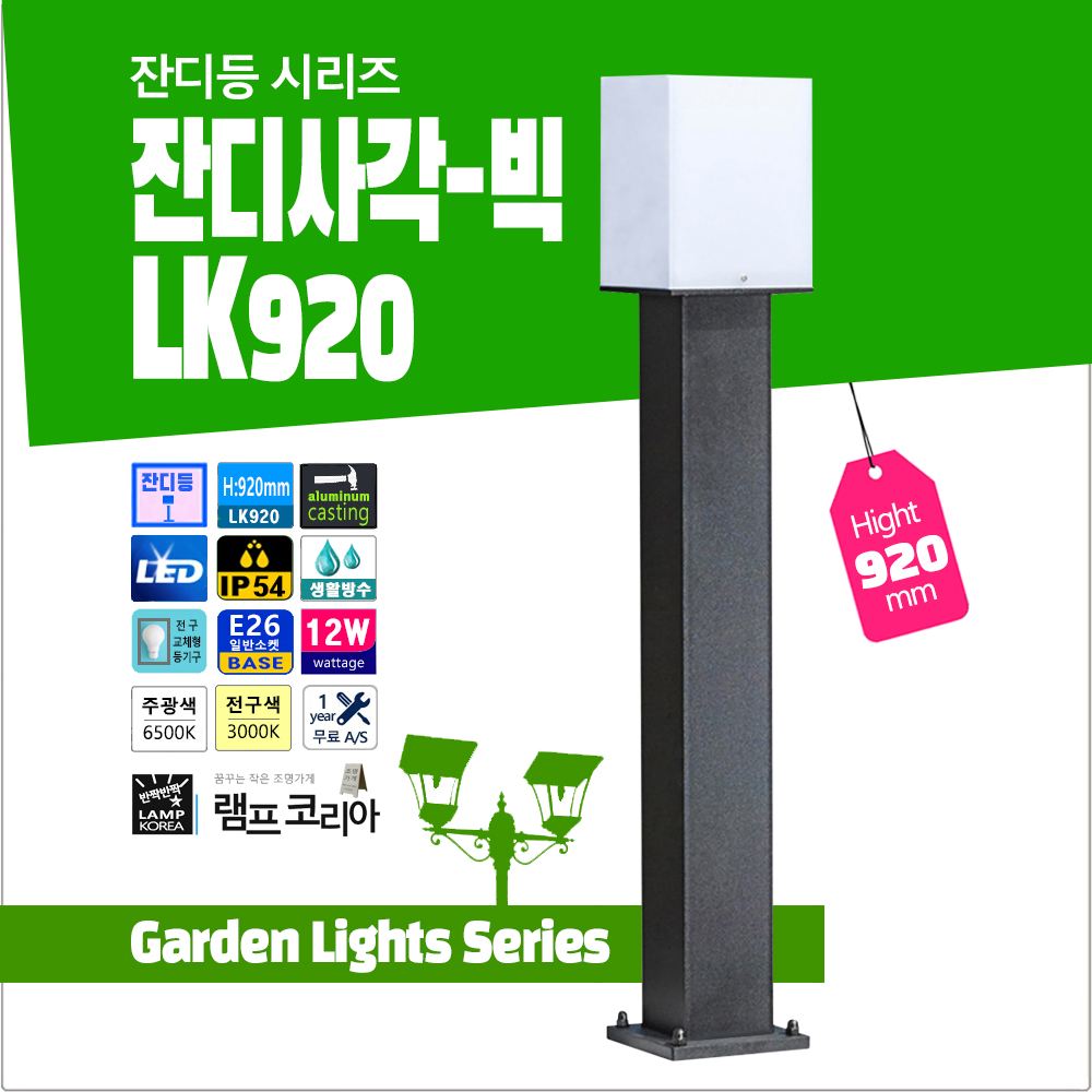 잔디사각-빅 LK920 W160 X D160 X H920mm 검정색 (기본색) LED12W 램프 사용 알루미늄 다이케스팅 국내산 잔디등 정원등