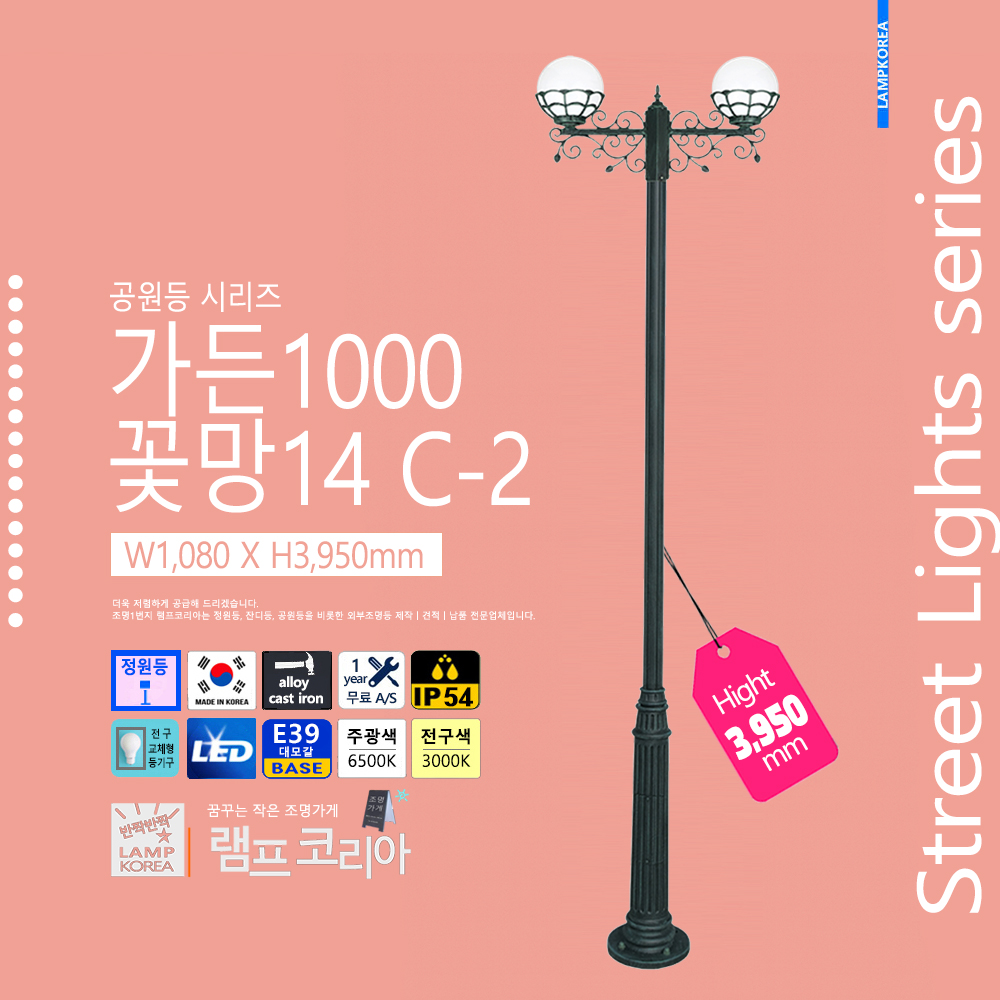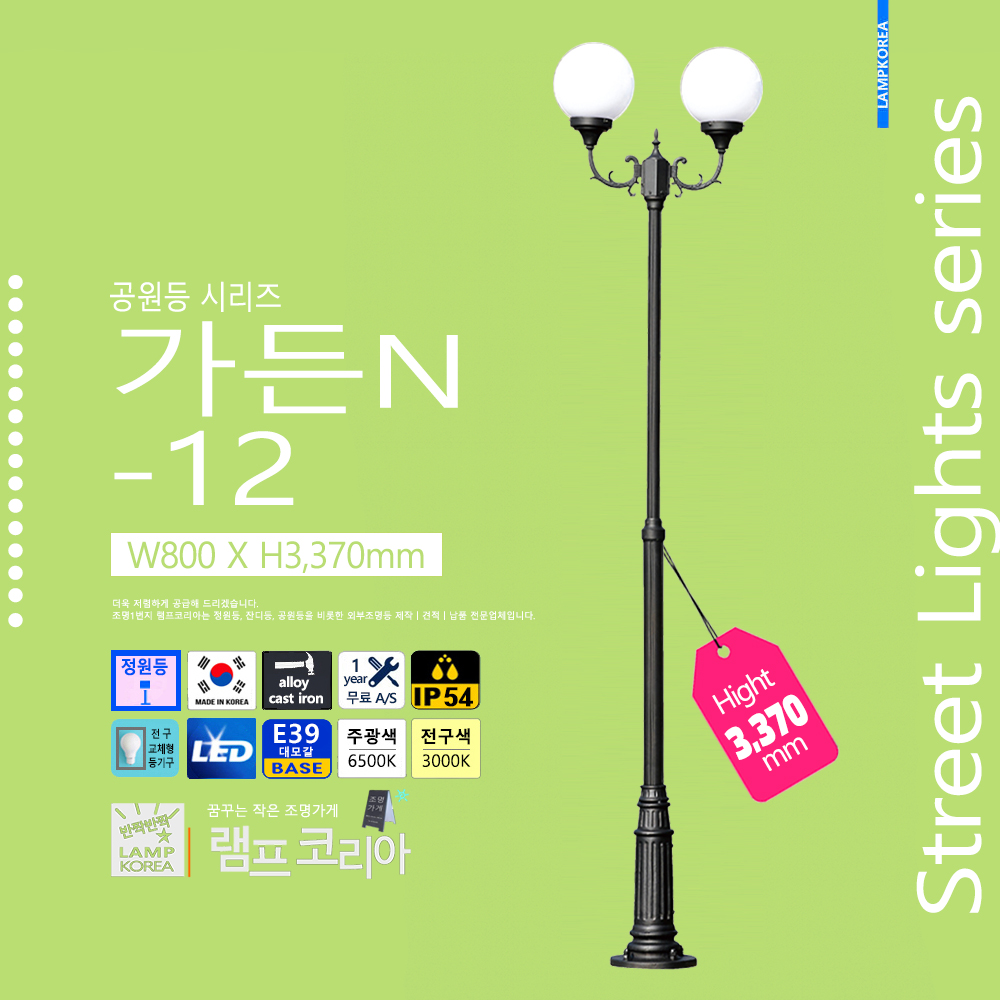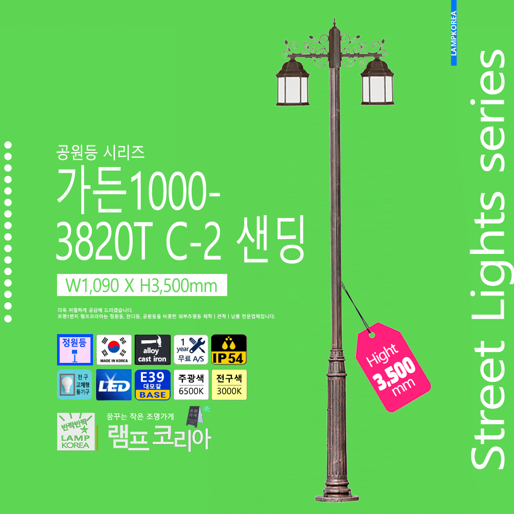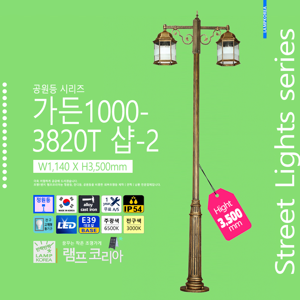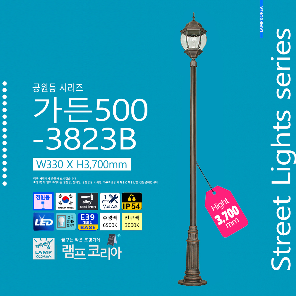 중형 공원등 가든500-3823B W330 X H3,700 알루미늄 주철합금 E39 LED전구사용 국내산 정원등