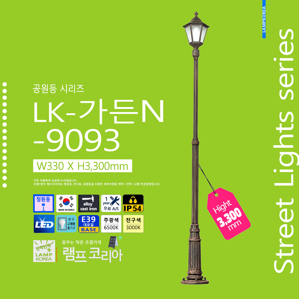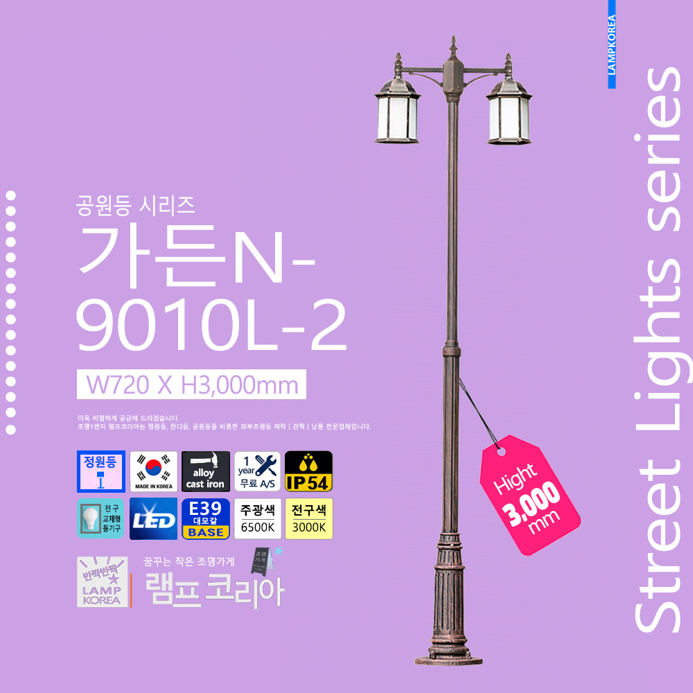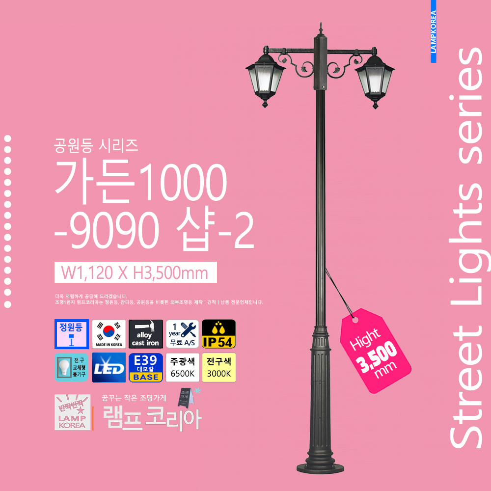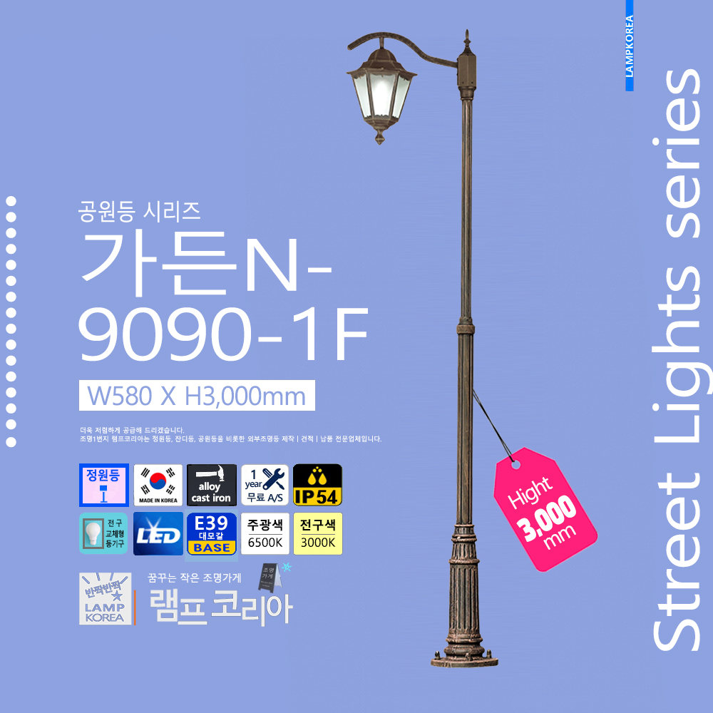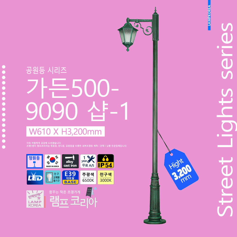 중형 공원등 가든500-9090 샵-1 W610 X H3,200 알루미늄 주철합금 E39 LED전구사용 국내산 정원등