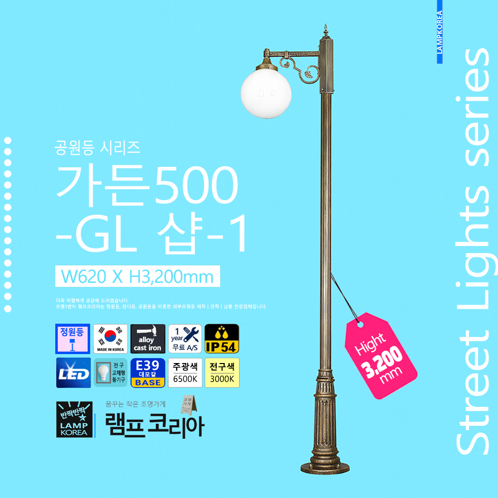 중형 공원등 가든500-GL 샵-1 W620 X H3,200 알루미늄 주철합금 E39 LED전구사용 국내산 정원등