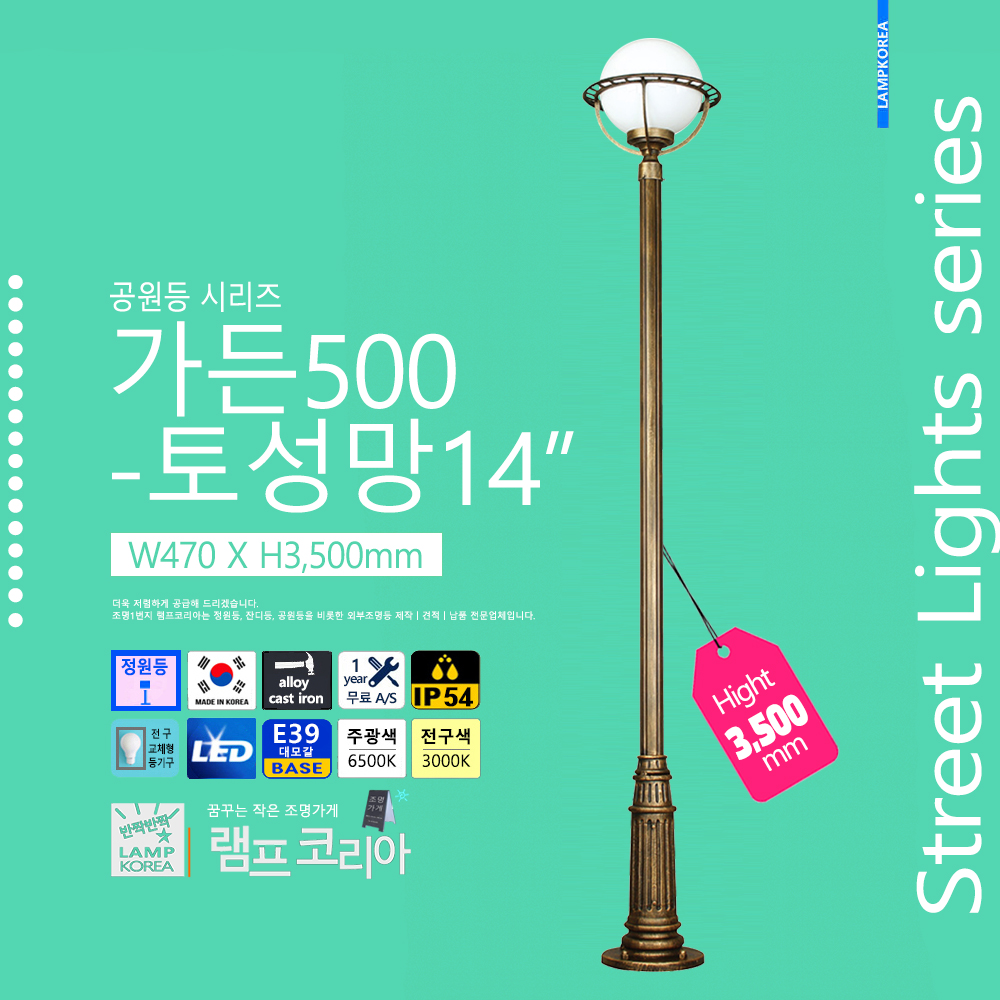 중형 공원등 가든500-토성망 14인치 W470 X H3,500 알루미늄 주철합금 E39 LED전구사용 국내산 정원등
