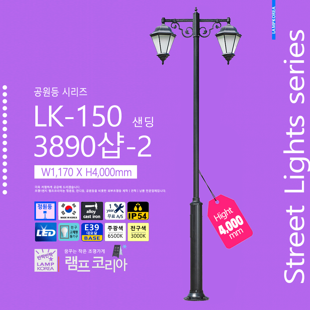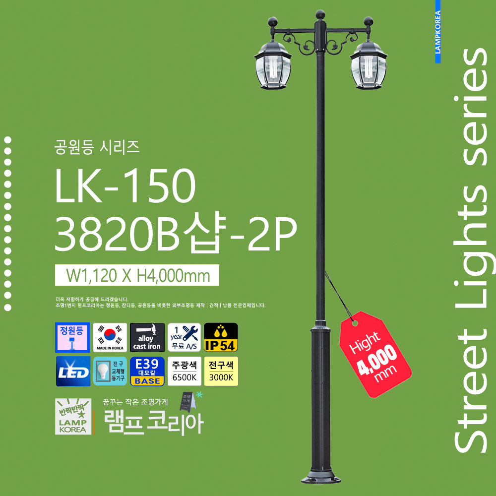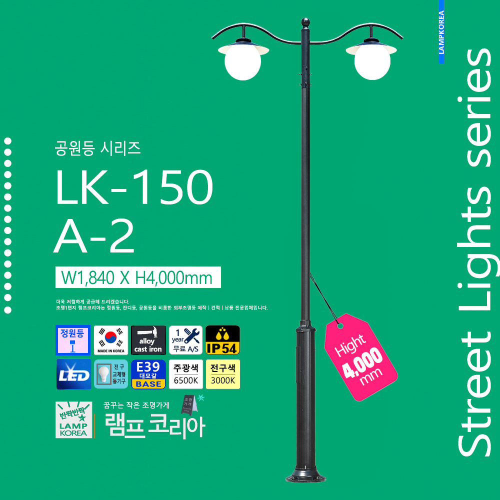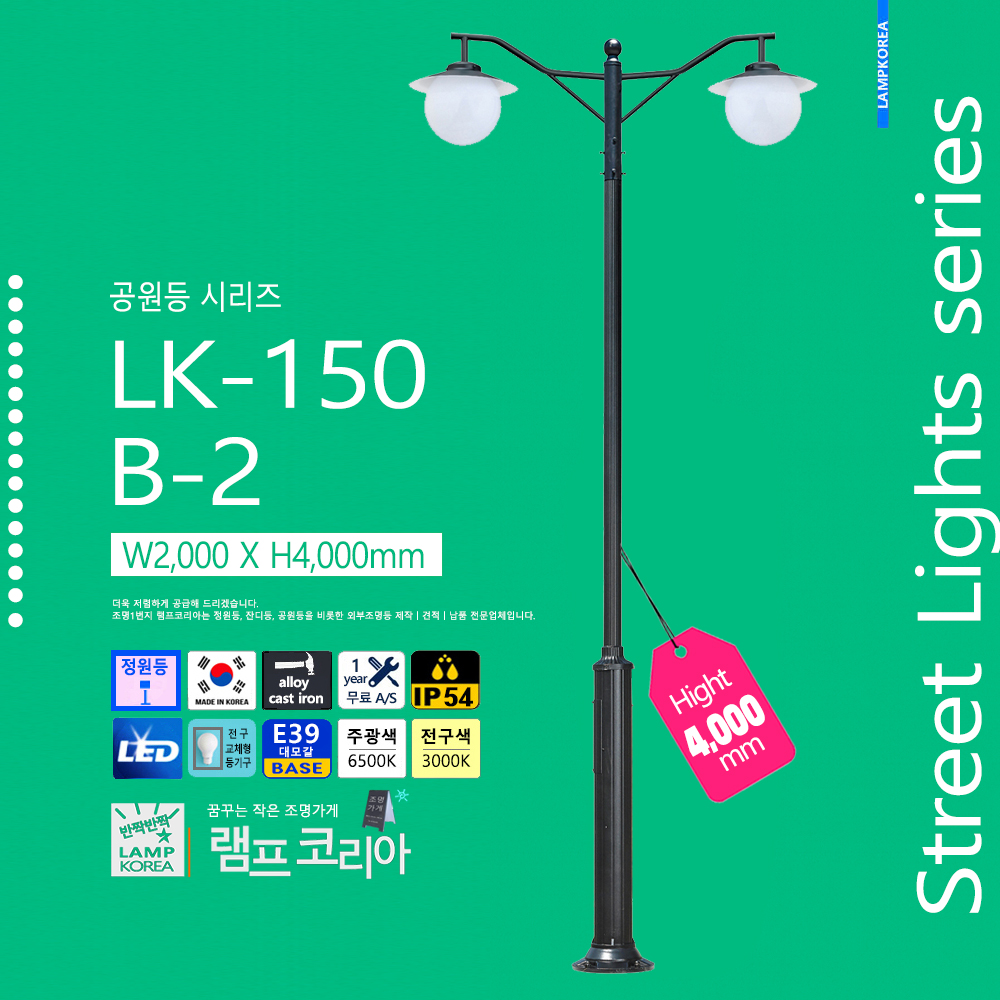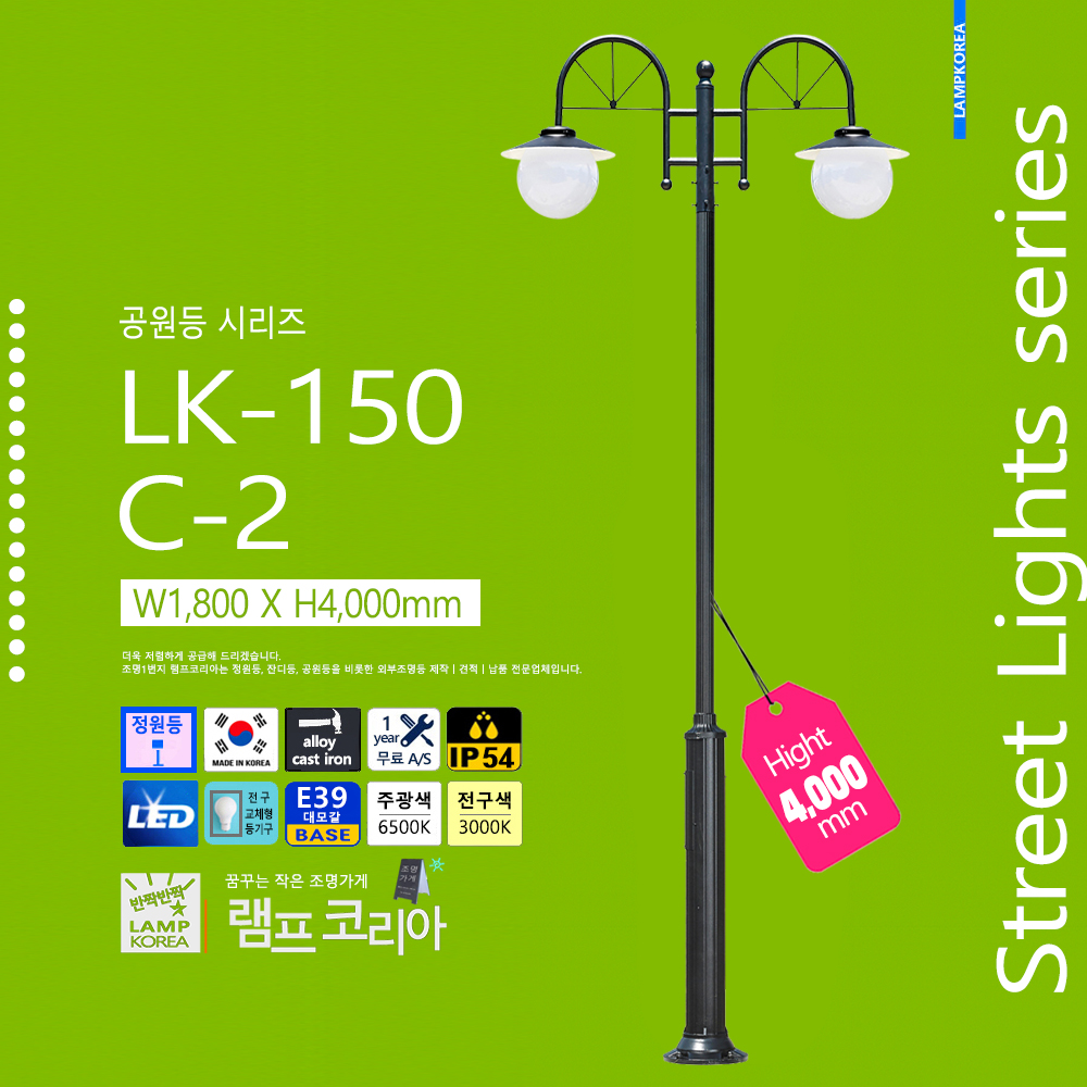 대형 공원등 LK-150-C-2 W1,800 X H4,000 알루미늄 주철합금 국내산 E39 LED50WX2 전구사용 (별매)