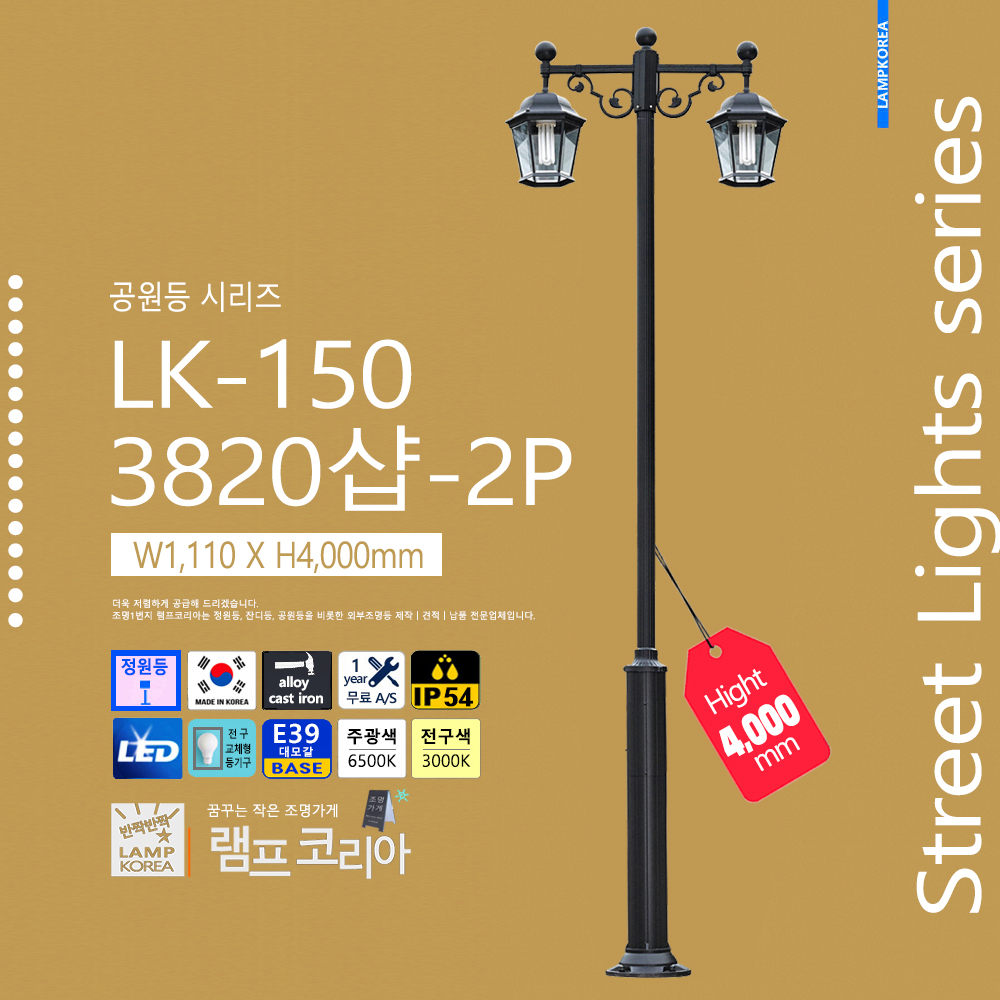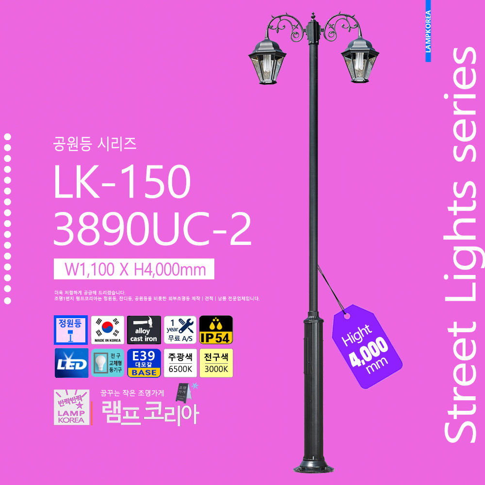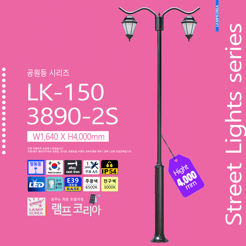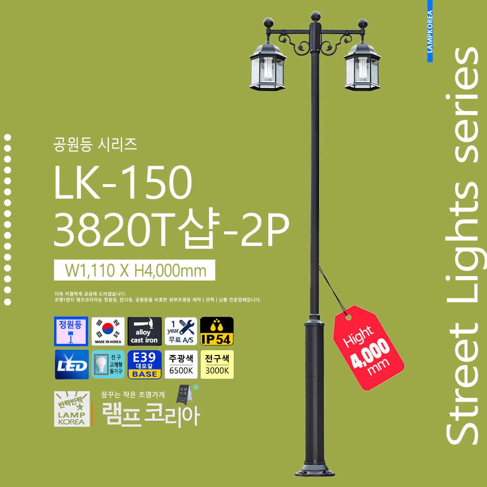 대형 공원등 LK-150-C-2 W1,800 X H4,000 알루미늄 주철합금 국내산 E39 LED50WX2 전구사용 (별매)