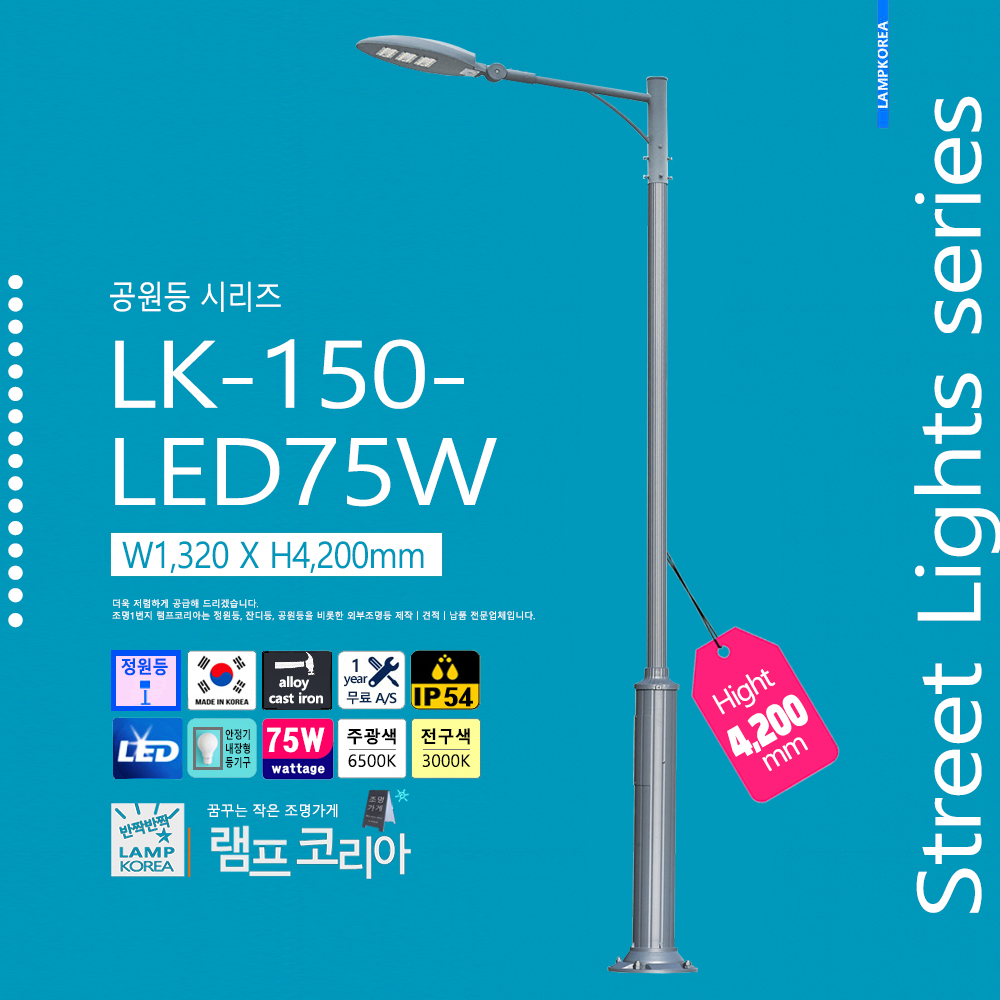 대형 공원등 LK-150-LED 75W W1,320 X H4,200 알루미늄 주철합금 국내산 LED25WX3 일체형 KS고효율