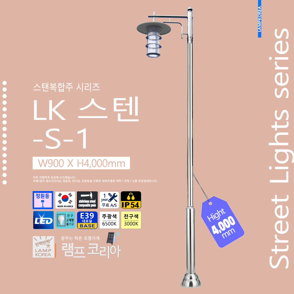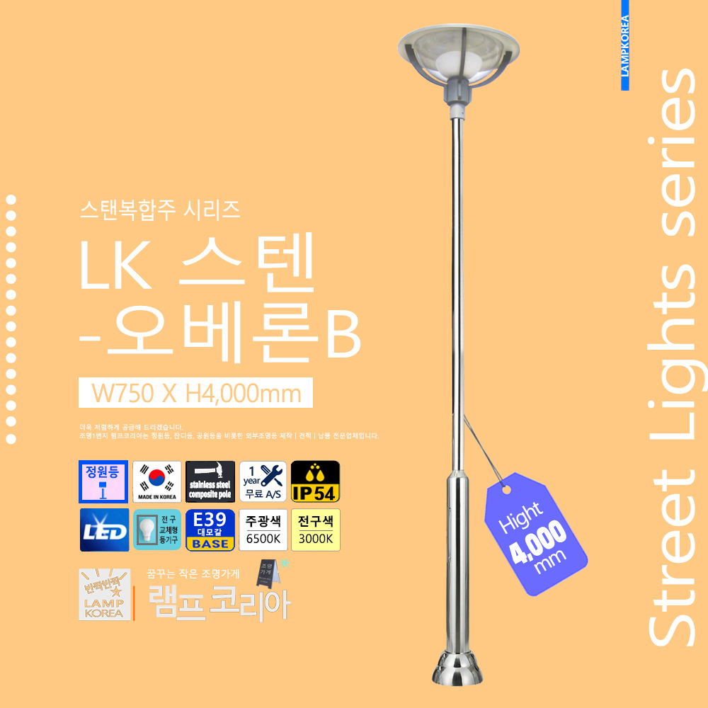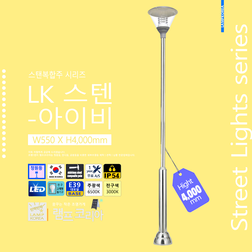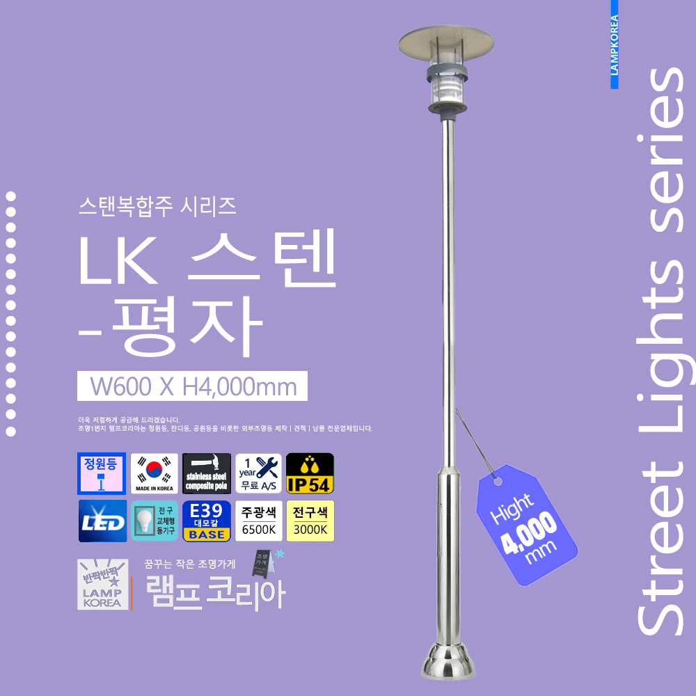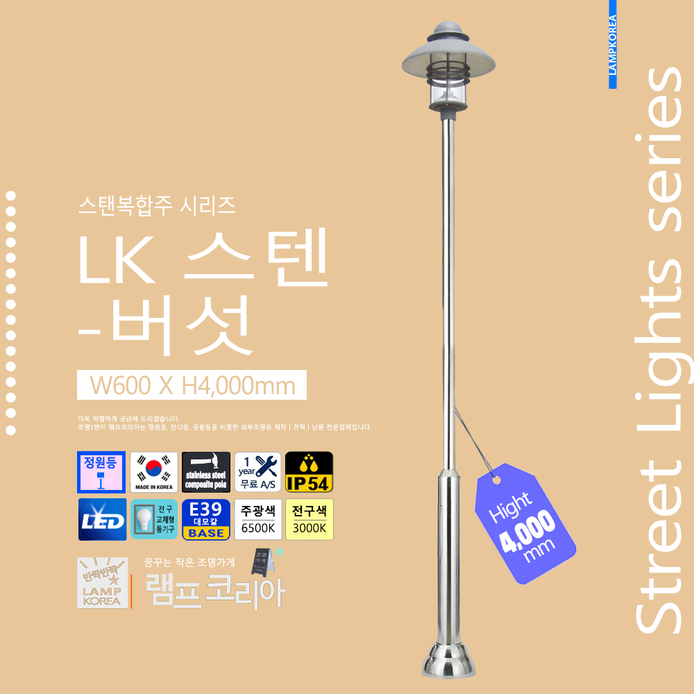 스텐복합주 LK-스텐-버섯 W600 X H4,000 스테인레스 스틸 E39 LED전구사용 국내산